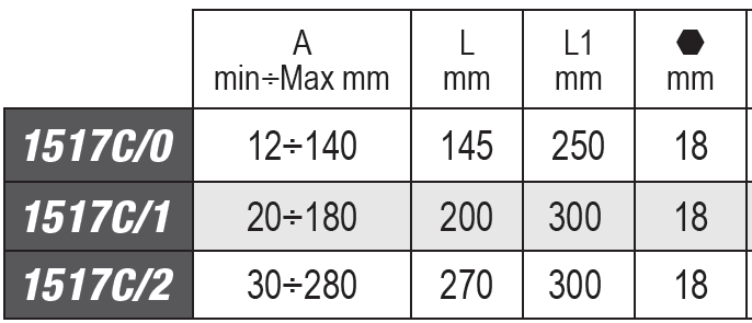 Questa caratteristica facilita il posizionamento ed il bloccaggio dell’estrattore sul particolare da estrarre. Una volta posizionato, le griffe si possono bloccare tramite la ghiera. La particolare traversa presente sull’1517C ha 4 sedi che permettono all’estrattore di poter essere utilizzato sia con 2 griffe, per un lavoro più facile e veloce, oppure con 3 griffe per una maggiore stabilità di lavoro.